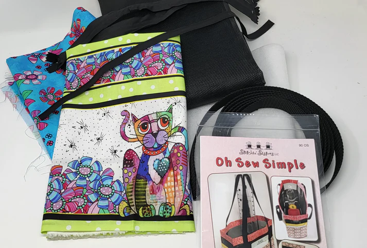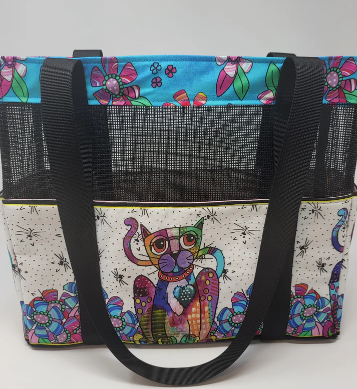 This tote has pockets on the front, back, and sides. Elastic on the inside of the tote holds water bottles, etc. Included are instructions to make project bags that are great for your stitching projects, kits, patterns, cosmetics, etc…